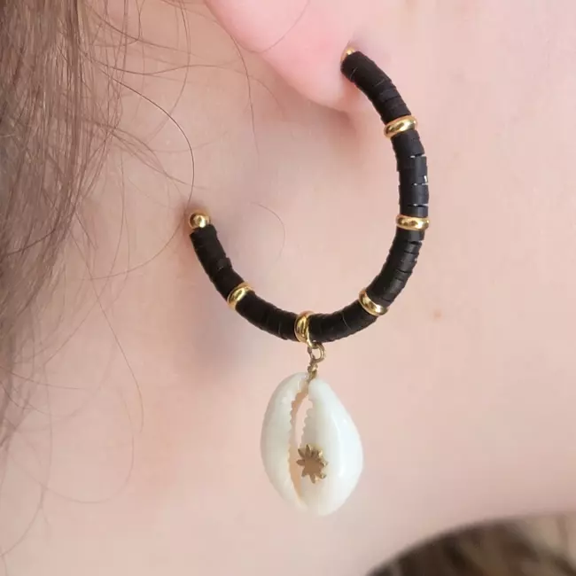 Plonge dans une ambiance bohème chic avec ces superbes créoles dorées, sublimées par un vrai coquillage cauri agrémenté d’une petite fleur dorée, le tout sublimé par des perles heishi noires mates et des intercalaires dorés brillants. Un bijou aussi élégant que lumineux, parfait pour sublimer tes tenues estivales