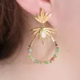 Le cercle inférieur est agrémenté d’une rangée de perles naturelles multicolores, sélectionnées avec soin pour leur teinte unique. Ces perles, dans des nuances de vert, beige, brun et blanc, apportent une note colorée et naturelle qui rappelle les bijoux ethniques et bohèmes. Chaque perle étant unique, chaque paire de boucles d’oreilles est légèrement différente, ce qui en fait un accessoire exclusif.
