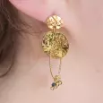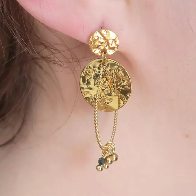 Détails : Disques martelés, anneaux torsadés, pampilles dorées, pierres naturelles vertes