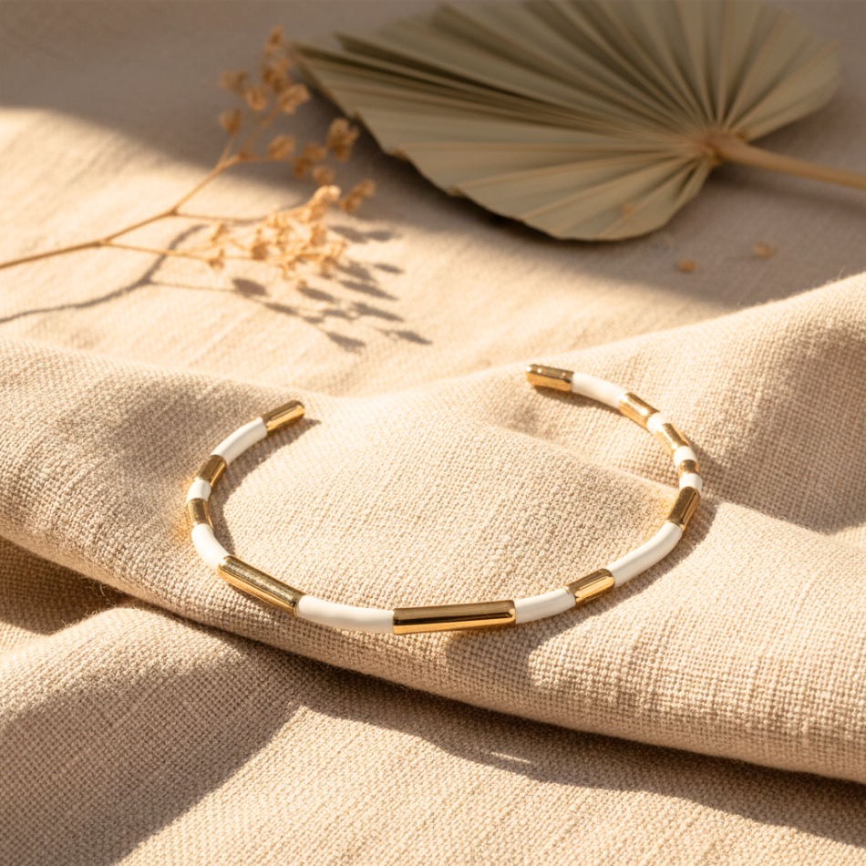 Armreif aus weißem Perlmutt – Offenes Schmuckstück aus vergoldetem Edelstahl