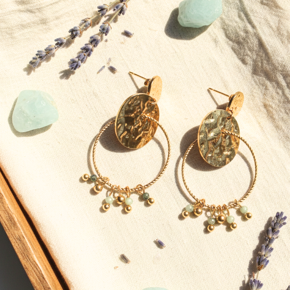 Gehämmertes Goldohrring mit Quasten – Edelstahl und grüne Natursteine