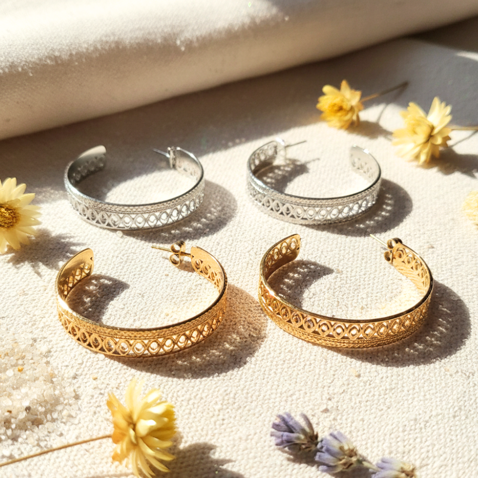 Große, durchbrochene Creolen aus gold- oder silberfarbenem Edelstahl – Ohrringe im Bohemian-Chic-Stil