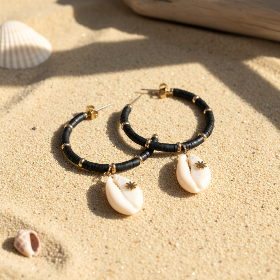 Ohrringe mit Kaurimuscheln – Schwarzer und goldener Strandschmuck für Damen – Wasserfester Edelstahl
