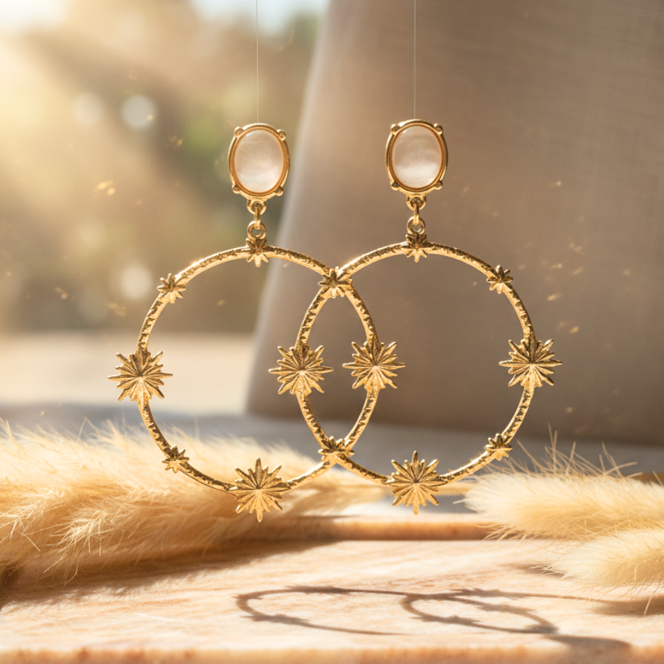 Goldfarbene, sonnenförmige Hängeohrringe aus Edelstahl – Perlmuttstein, im Bohème-Chic-Stil