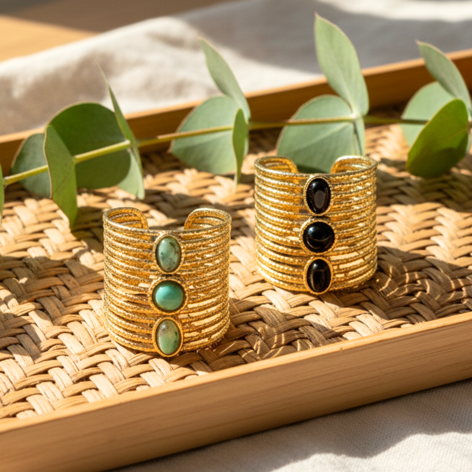 Damenring aus mehrreihigem Gold, Edelstahl mit Natursteinen