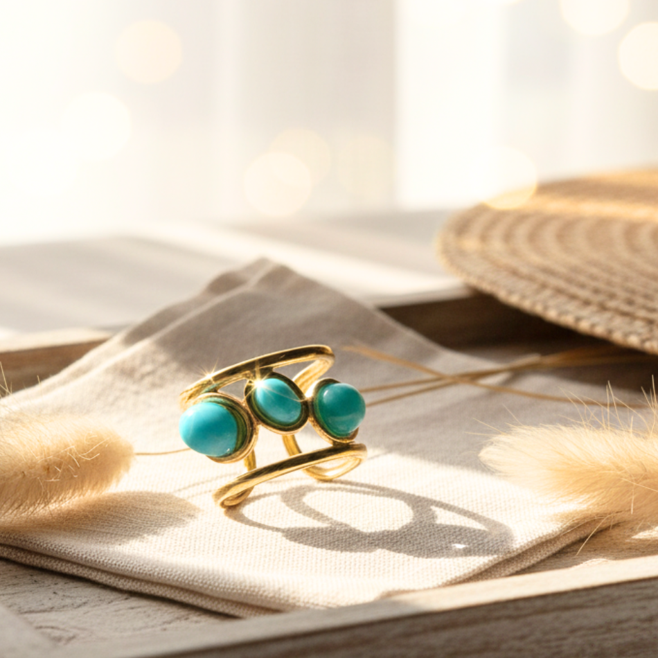 Verstellbarer goldfarbener Damenring mit türkisblauen Steinen – Edelstahl