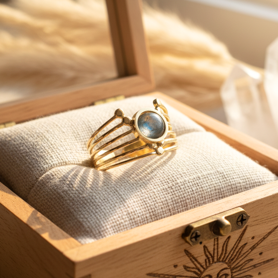 Damenring aus gehämmertem Gold mit Labradorit, verstellbarer Edelstahl