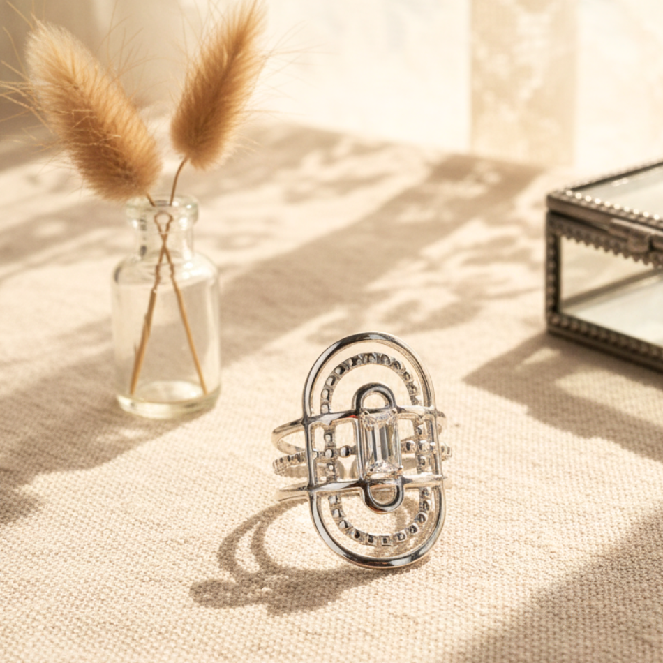 Dieser Ring aus robustem, hypoallergenem Edelstahl ist wasser- und oxidationsbeständig und begleitet Sie jeden Tag, ohne seinen Glanz zu verlieren. Sein ovales Design , verziert mit einem funkelnden rechteckigen Strassstein , vereint Modernität und Retro-Charme zu einem eleganten und trendigen Look.