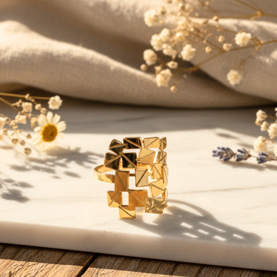 Mit seinen goldenen Dreiecksformen und dem filigranen Design besticht dieser Ring durch seinen minimalistischen Art-déco- Stil. Ein echtes Statement-Piece, das sowohl Alltagsoutfits als auch elegante Abendgarderobe perfekt ergänzt.