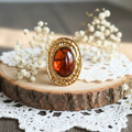 Dieser ovale, vergoldete Ring mit Bernstein-Effekt ist ein markantes und elegantes Schmuckstück, das sofort ins Auge fällt. Sein ausdrucksstarkes Design präsentiert einen Harzstein in Bernstein-Optik mit warmen Reflexen, der von einem gehämmerten Goldband umrahmt wird und ihm einen charmanten Vintage-Look mit raffiniertem Touch verleiht.