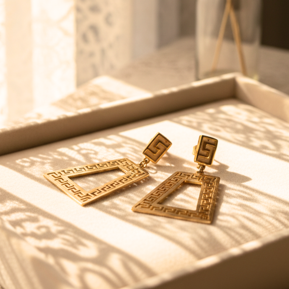 Diese Ohrringe sind mehr als nur Accessoires. Ihre durchbrochene, geometrische Form fängt das Licht elegant ein, während ihre grafischen Details, inspiriert vom griechischen Mäandermotiv, Unendlichkeit und Harmonie symbolisieren. Ein Schmuckstück, das modern und zugleich bedeutungsvoll ist.