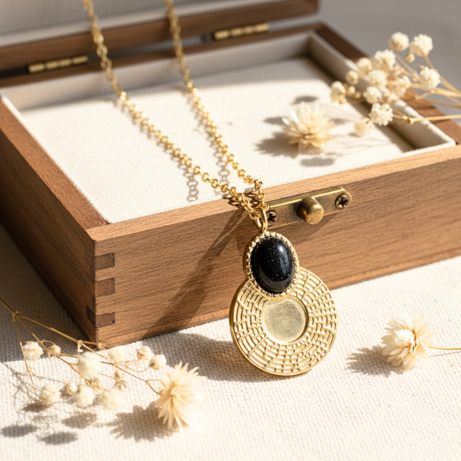 Diese außergewöhnliche Halskette vereint ein gehämmertes Goldmedaillon mit Sonnenschliff und einen ovalen, schwarzblauen Sandstein mit bläulichen Reflexen, der mit Mikroglitter besetzt ist und an eine sternenklare Sommernacht erinnert. Der Stein symbolisiert Intuition , Schutz und Selbstvertrauen und verleiht Ihrem Look eine mystische und elegante Note.