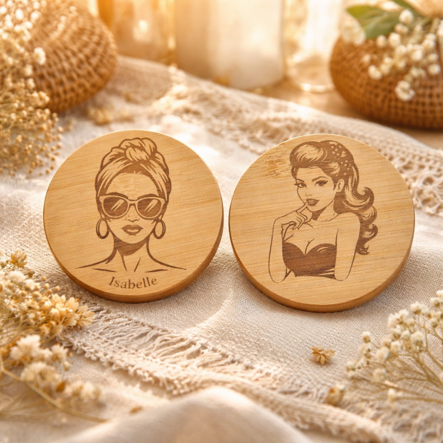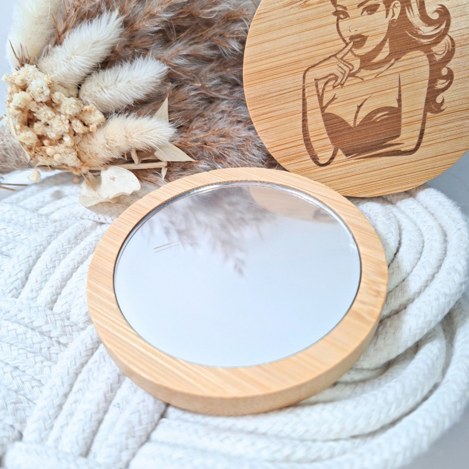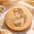 Pratique et élégant, ce miroir de poche personnalisé présente un miroir d’un côté et une face en bois gravée de l’autre, avec une illustration féminine et le prénom de votre choix.