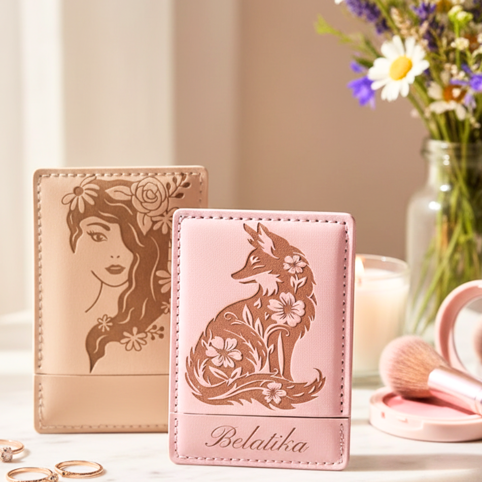Dieser personalisierbare Taschenspiegel vereint Eleganz und Zartheit und begleitet Sie durch den Alltag. Sein einzigartiges Design zeigt eine fein gravierte Fuchs- oder Frauenfigur mit Blumenmotiv – ein Symbol für Weiblichkeit und Sanftmut –, während die Namensgravur dem Spiegel eine persönliche und edle Note verleiht.