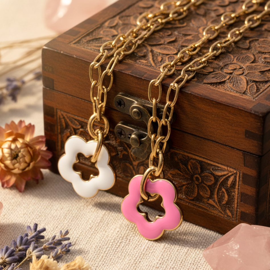 Pink or white acrylic flower necklace in gold-plated stainless steel – chunky links – trendy summer jewelry for women