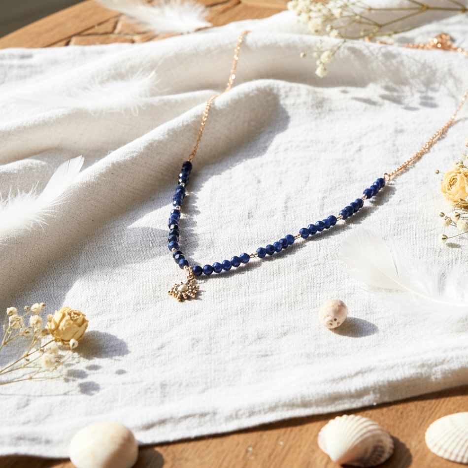 Gold sun necklace with navy blue pearls – Stainless steel – Elegant and bohemian women's jewelry