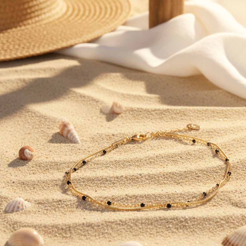 Double-strand gold anklet with turquoise stones, bohemian summer style