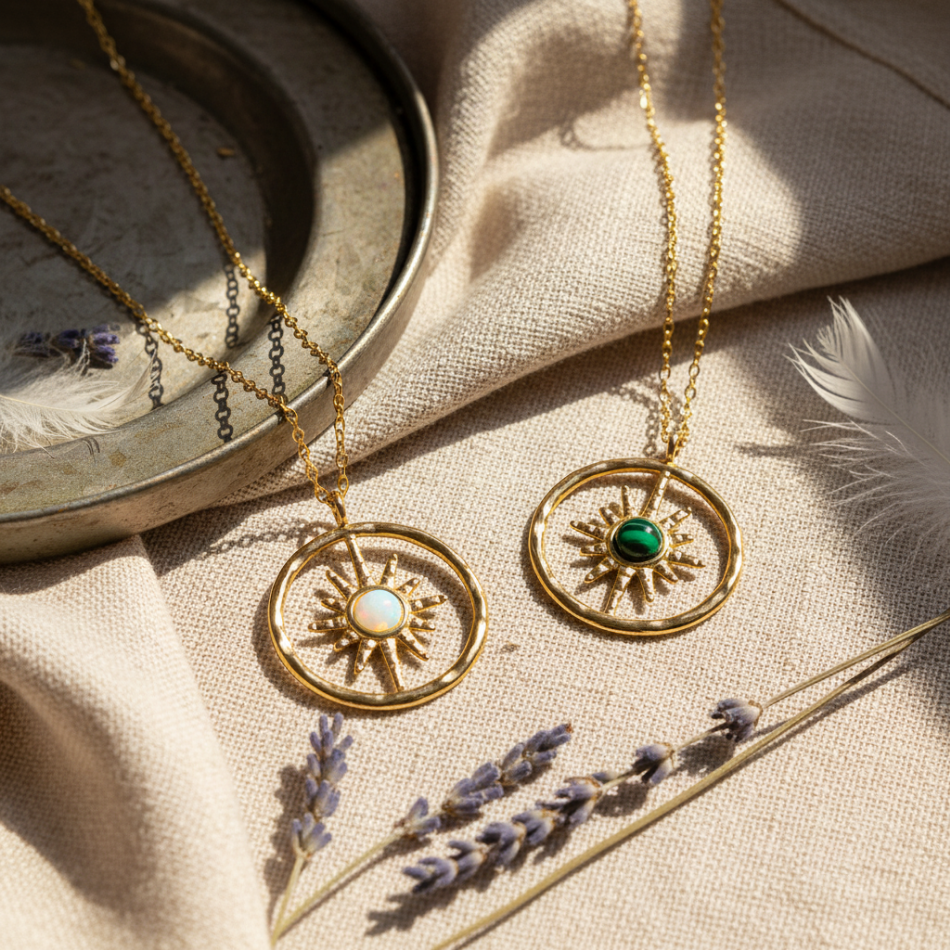 Gold sun necklace with natural stone – stainless steel – chic summer jewelry for women