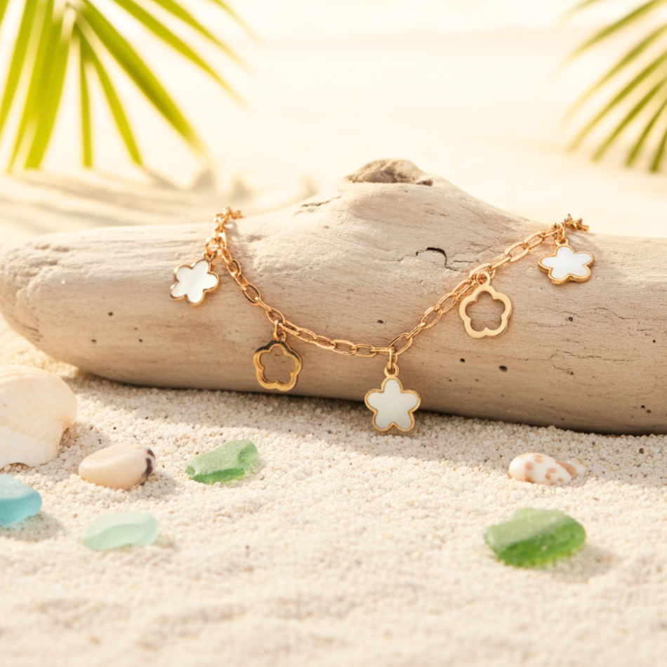 White flower anklet in gold or silver stainless steel – Elegant summer jewelry, water-resistant, with mother-of-pearl tassels
