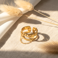 The combination of textures – chain, hammered, and delicate chain – creates a trendy stacked effect without the need for multiple rings. Every detail is carefully considered to offer a rock-chic and elegant look, perfect with casual jeans or a sophisticated dress.