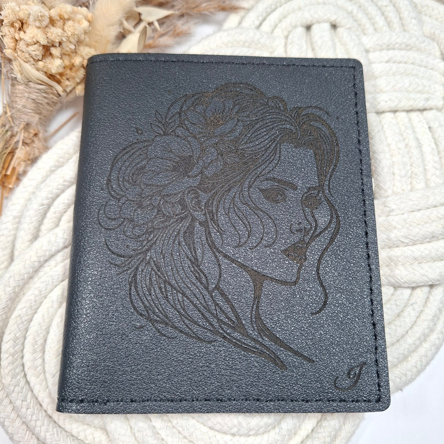 This customizable black card holder is a chic and practical accessory, perfect for adding a touch of elegance to your everyday life. Made of matte black faux leather , it stands out for its slim profile and delicate engraving , featuring a personalized initial accompanied by a floral motif.
