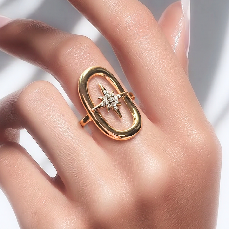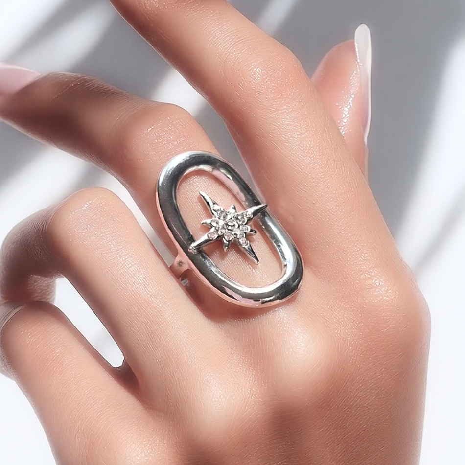 Son motif central en forme d’étoile à huit branches est orné de strass brillants soigneusement sertis, qui captent la lumière à chaque mouvement. L’étoile est encadrée par une forme ovale ajourée moderne, qui donne du relief à l’ensemble et habille élégamment la main.