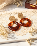 Ces boucles d’oreilles dorées et résine ambrée allient chaleur et modernité. Leur design sculptural associe une base dorée martelée à un anneau irrégulier en résine translucide ambrée, pour un effet lumineux et raffiné.