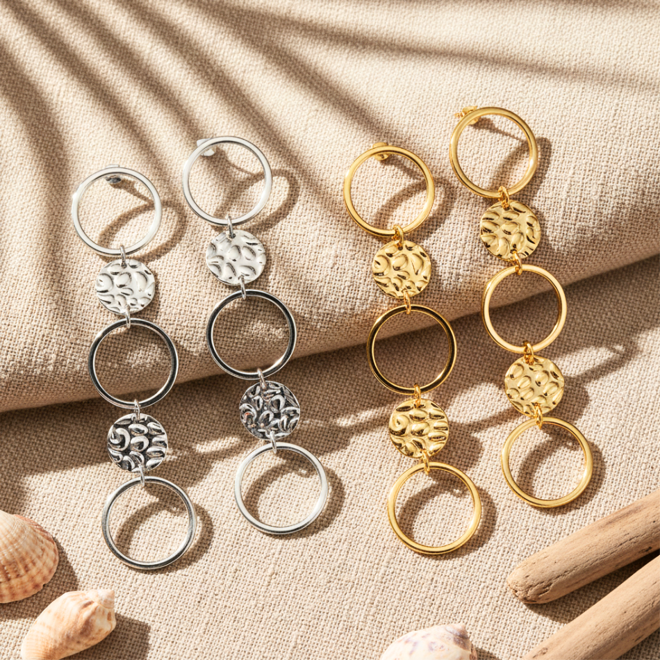 Ces boucles d’oreilles longues en acier inoxydable séduisent par leur design moderne et lumineux. Composées d’une alternance de ronds lisses et disques martelés, elles captent la lumière à chaque mouvement pour un effet éclatant.