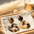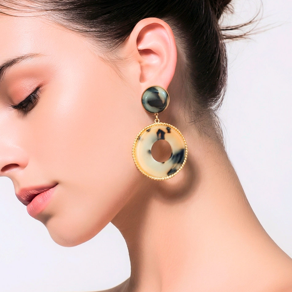 Ces boucles d’oreilles rondes en acier inoxydable et résine marron crème combinent élégance intemporelle et finitions soignées. Leur design ajouré met en valeur une résine marbrée marron et crème, entourée d’une monture dorée perlée qui capte délicatement la lumière.