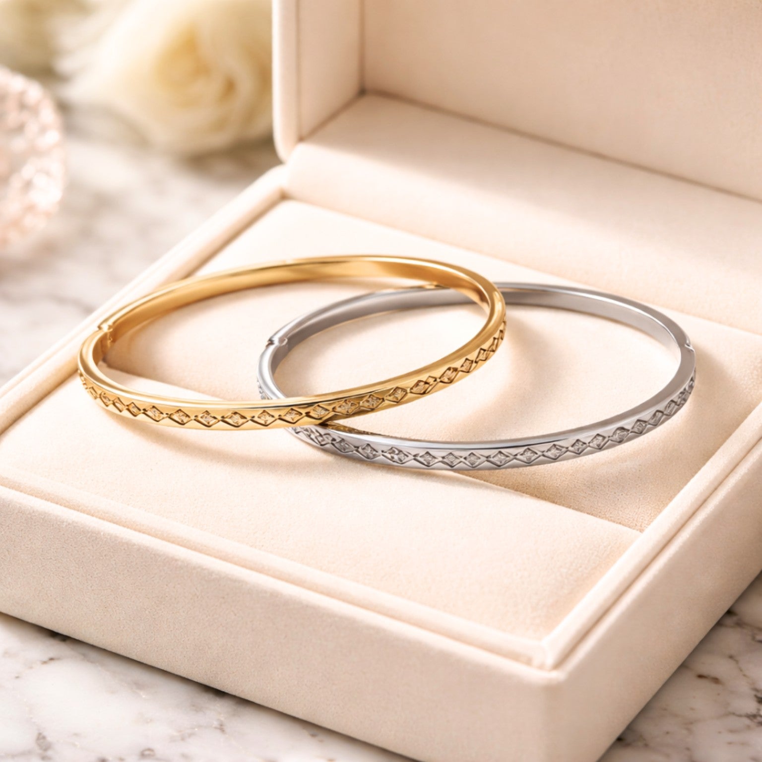 Bracelet conçu pour épouser naturellement le poignet et offrir un maintien confortable. Convient à la majorité des poignets féminins.