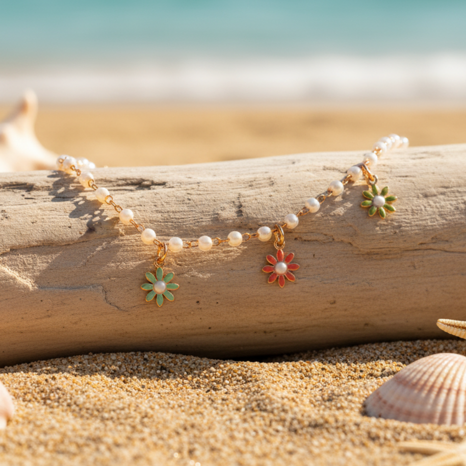 Sublimez votre tenue estivale avec cette chaîne de cheville délicate, alliant perles blanches lumineuses et pendentifs fleurs colorées émaillées. Son design romantique et bohème apporte une touche de fraîcheur et de gaieté, idéale pour vos journées en bord de mer, festivals ou occasions spéciales.