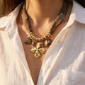 Orné de perles et pendentifs dorés soigneusement sélectionnés, ce bijou attire la lumière et met en valeur le décolleté avec subtilité. Le collier se ferme à l’aide d’une chaîne d’extension dorée, permettant un ajustement parfait selon votre tenue.
