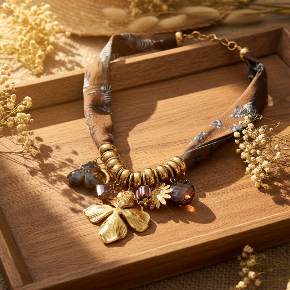 Ce collier foulard zèbre et breloques dorées est une création audacieuse qui allie style exotique et élégance raffinée. Son ruban imprimé motif zèbre sur fond brun apporte une touche sauvage et tendance, tandis que les éléments dorés et les charms floraux et géométriques ajoutent une note chic et féminine.